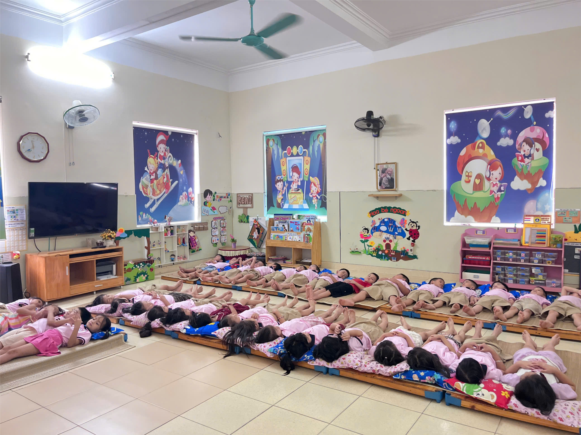 - Đến giờ ngủ trưa, trẻ biết tự giác trải chiếu ngay ngắn, đúng vị trí được phân công.