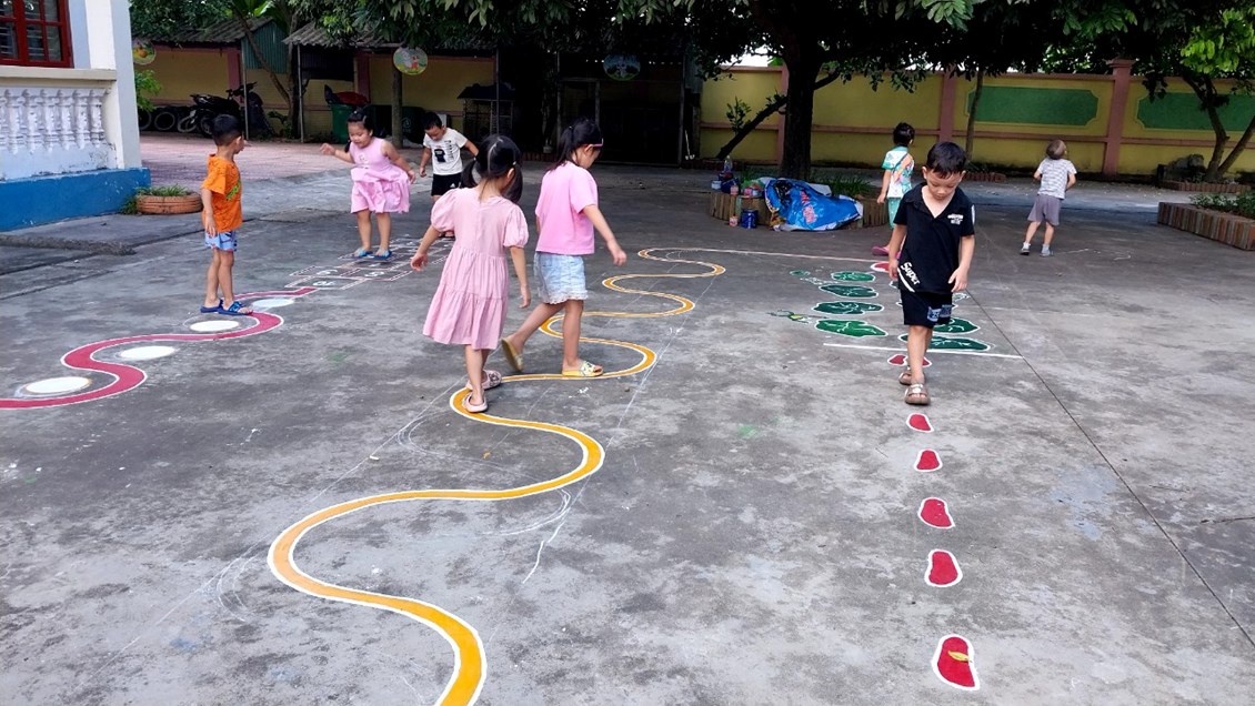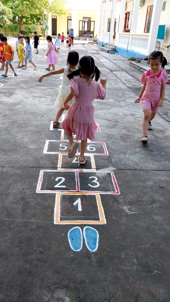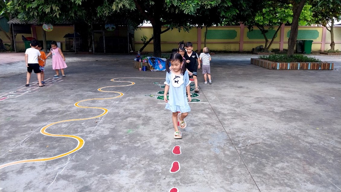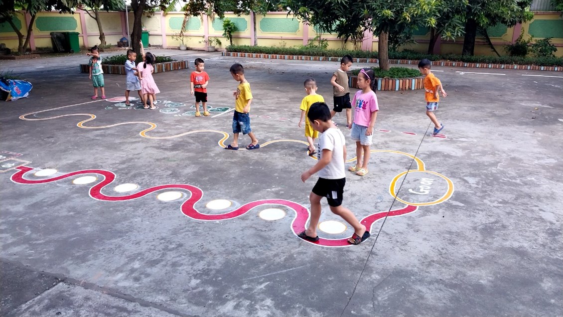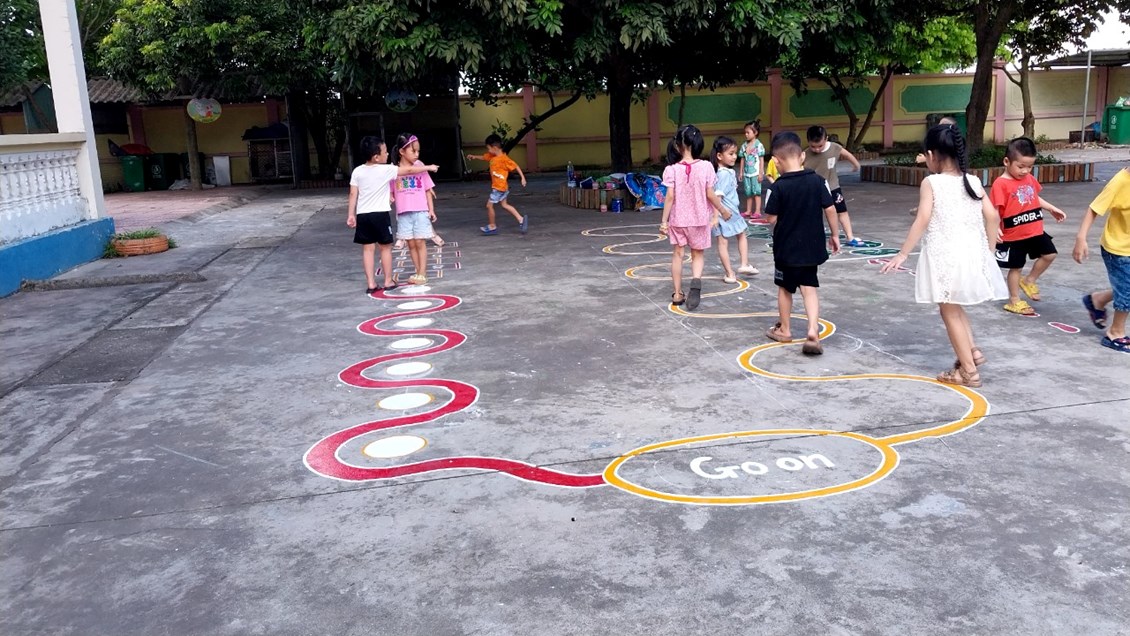 Để những khoảng sân trở thành khu vui chơi thú vị của trẻ, các cô giáo với ý tưởng sáng tạo đã vẽ thiết kế các hình đa dạng trên sân trường thành các trò chơi vô cùng hấp dẫn trẻ. Mặc dù vất vả nhưng đổi lại trẻ được thoả sức vận động, nâng cao sức khoẻ và đặc biệt là nụ cười sảng khoái và hạnh phúc đáng yêu từ trẻ.
