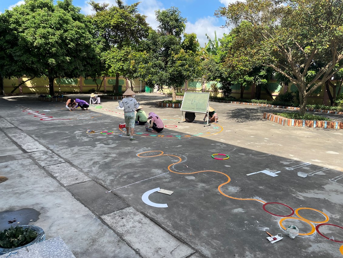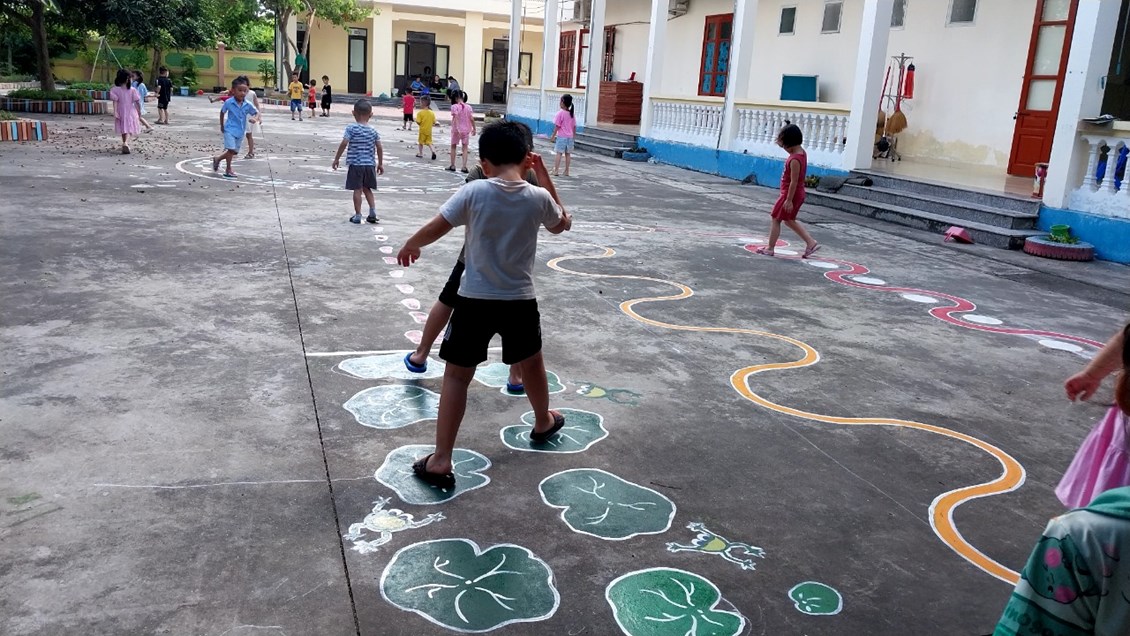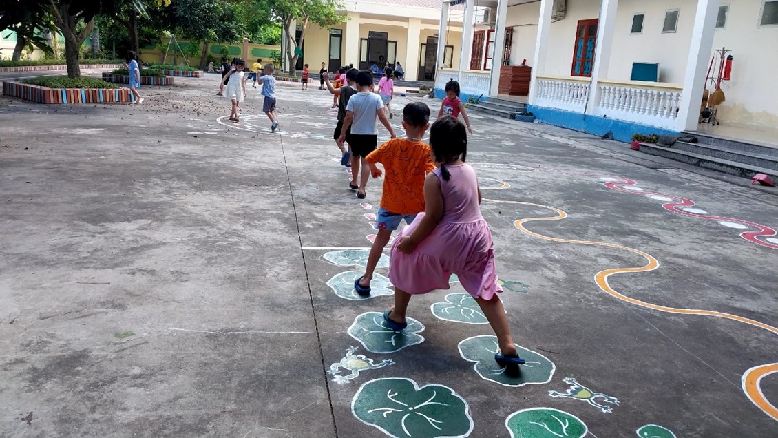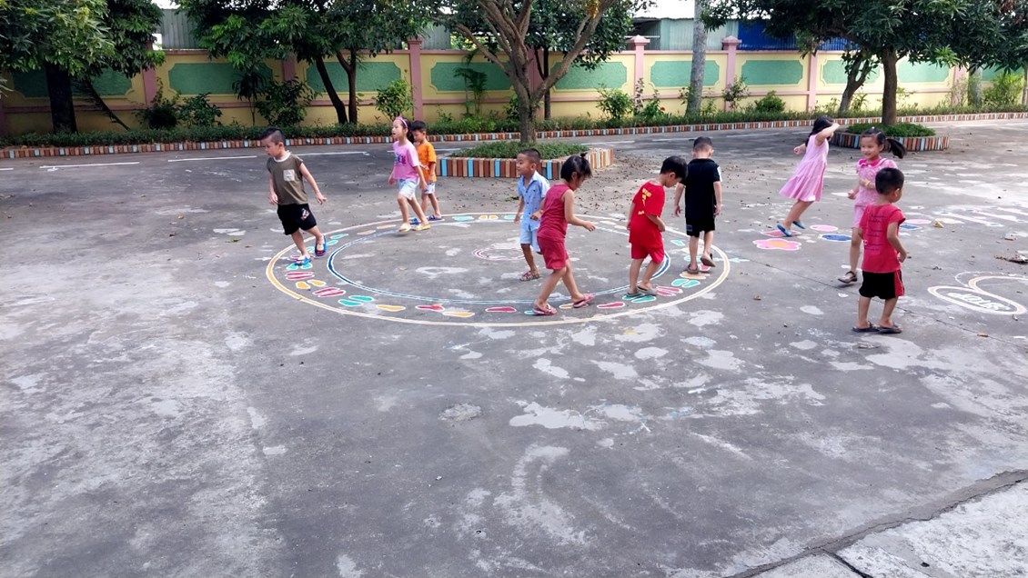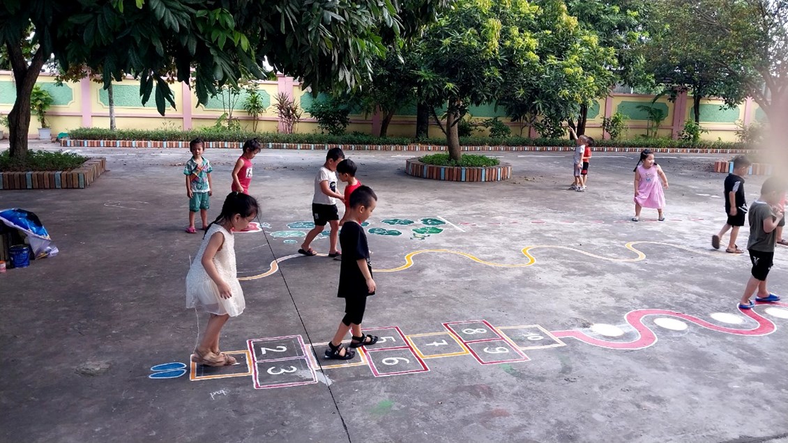 Để những khoảng sân trở thành khu vui chơi thú vị của trẻ, các cô giáo với ý tưởng sáng tạo đã vẽ thiết kế các hình đa dạng trên sân trường thành các trò chơi vô cùng hấp dẫn trẻ. Mặc dù vất vả nhưng đổi lại trẻ được thoả sức vận động, nâng cao sức khoẻ và đặc biệt là nụ cười sảng khoái và hạnh phúc đáng yêu từ trẻ.