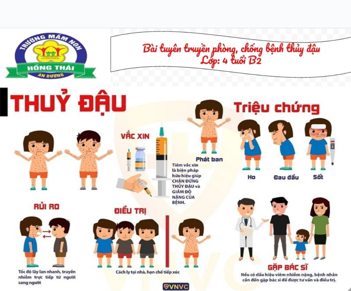 Để chủ động triển khai các biện pháp phòng chống dịch, không để dịch bệnh nói chung và bệnh thủy đậu nói riêng bùng phát, lan rộng, hạn chế tối đa số mắc và tử vong. Trường mầm non Hồng Thái, tuyên truyền tới toàn thể cán bộ, giáo viên và nhân viên và phụ huynh học sinh cách phòng chống dịch bệnh thủy đậu.