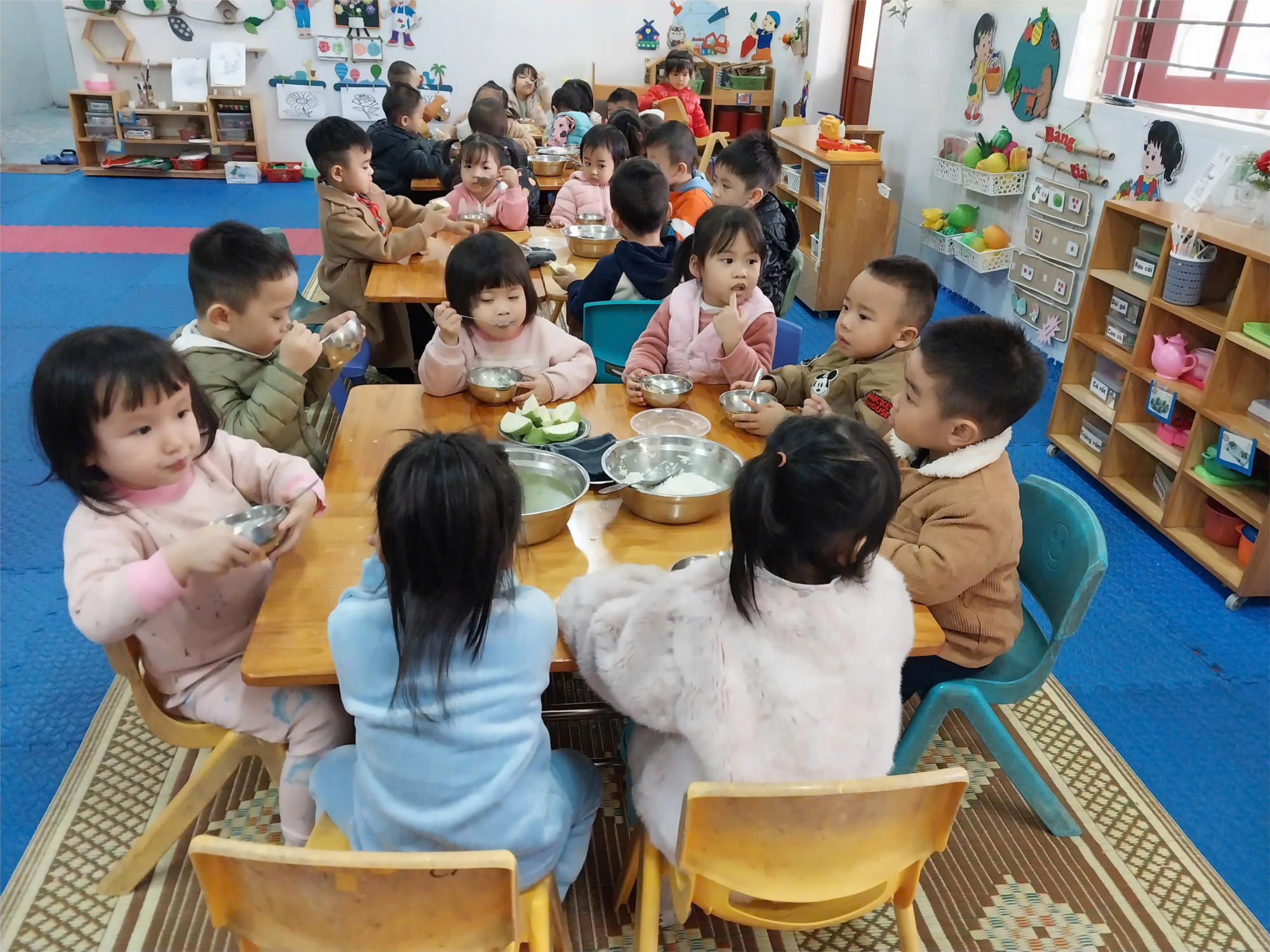 Giờ ăn trưa của các con là khoảng thời gian quan trọng giúp các con bổ sung năng lượng sau một buổi sáng học tập và vui chơi. Các cô giáo sẽ hướng dẫn các con rửa tay sạch sẽ trước khi ăn, sắp xếp chỗ ngồi ngay ngắn và các con thưởng thức bữa ăn trong không khí vui vẻ. Thực đơn của các con được thiết kế đầy đủ dinh dưỡng, bao gồm cơm, canh, món mặn (rau, củ) và hoa quả tráng miệng để đảm bảo sự phát triển toàn diện. Trong suốt bữa ăn, các con được rèn luyện kỹ năng tự phục vụ, biết cách cầm thìa, muỗng và ăn uống gọn gàng. Sau khi ăn xong, các con được nghỉ ngơi để chuẩn bị cho các hoạt động buổi chiều.