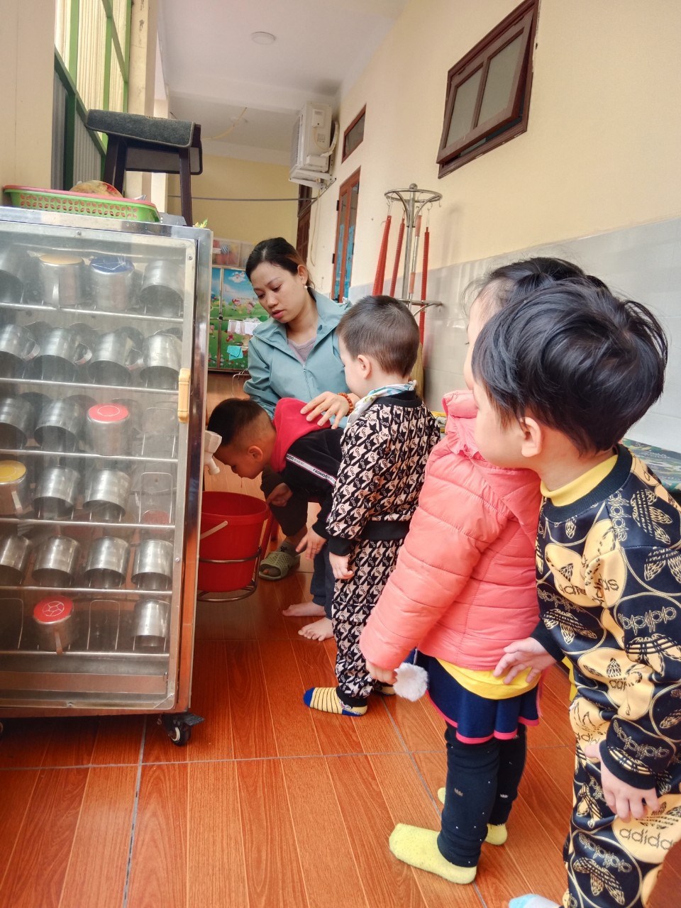 Các bé tuy bé nhất trường nhưng thực hiện các hoạt động rất nghiêm túc và nề nếp nhé. Bé được vệ sinh rửa tay-mặt trước giờ ăn. Trong giờ ăn bé ngồi nghiêm túc và ăn hết xuất, sau giờ ăn bé biết lau miệng uống nước và súc miệng bằng nước muối sau đó bé được cô đưa vào giấc ngủ với những bản nhạc nhẹ nhàng. Bé đến trường thật là ngoan.