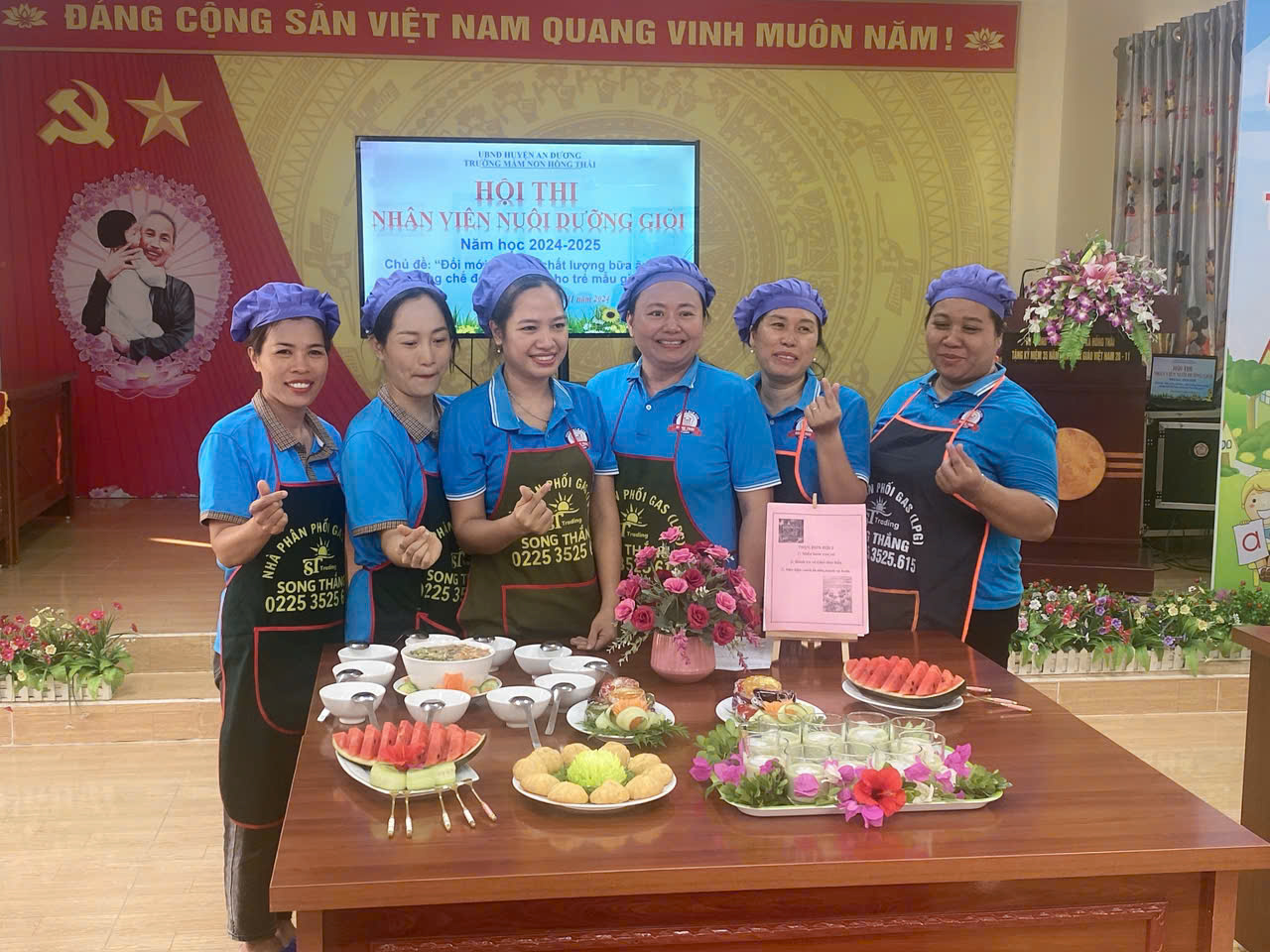 Hòa chung không khí vui tươi, phấn khởi chào mừng ngày nhà giáo Việt Nam 20/11, Chiều ngày 19 tháng 11 năm 2024, Trường mầm non Hồng Thái đã tổ chức Hội thi “Nhân viên nuôi dưỡng giỏi” Năm học 2024-2025 với chủ đề: “Đổi mới, cải tiến chất lượng bữa ăn phụ trong chế độ thực đơn cho trẻ MG”. Mục đích của Hội thi tạo cơ hội cho đội ngũ NVND rèn luyện nâng cao trình độ tay nghề. Bổ sung món ăn mới sáng tạo làm phong phú thêm thực đơn, cân đối khẩu phần dinh dưỡng và nâng cao hơn nữa chất lượng chế biến món ăn cho trẻ hàng ngày. Tạo một sân chơi bổ ích giúp cho đội ngũ NVND củng cố và mở rộng kiến thức thông qua 2 phần thi lý thuyết với 20 câu hỏi trắc nghiệm liên quan đến kiến thức dinh dưỡng, chế biến, ATTP và thực hành mỗi đội sáng tạo chế biến 3 món ăn bữa phụ cho MG.