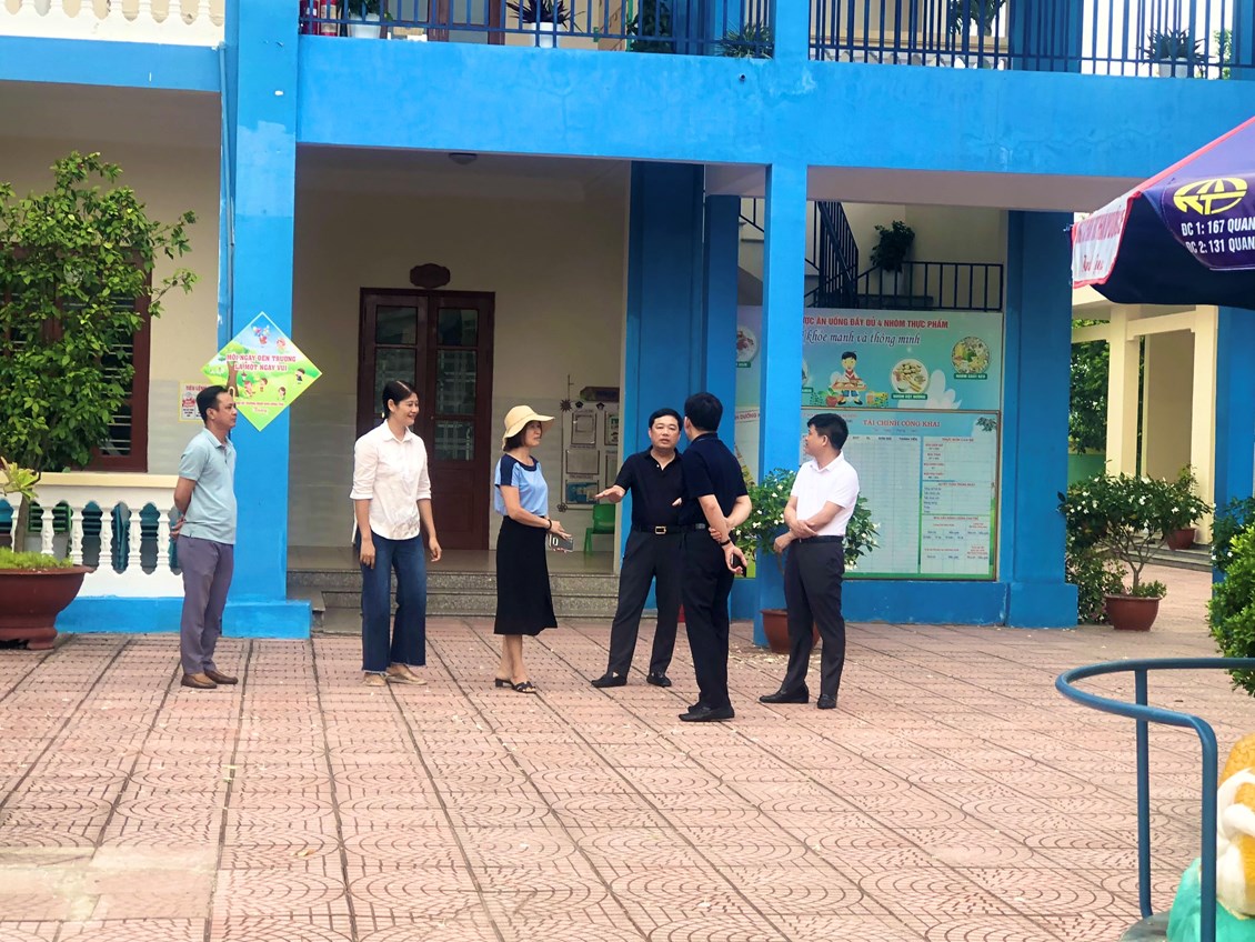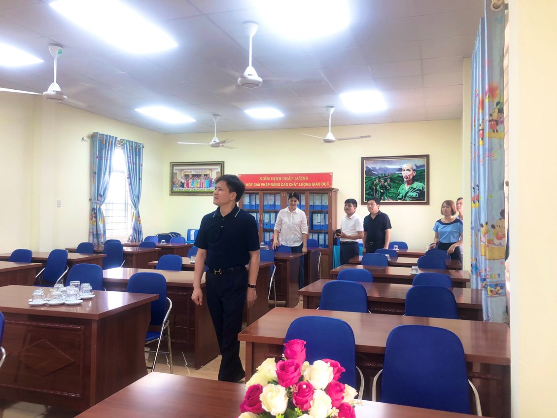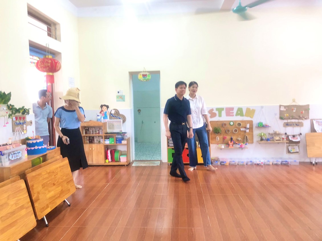 Đoàn đã kiểm tra toàn bộ công tác chuẩn bị các điều kiện cho ngày khai giảng, thăm cảnh quan môi trường, bếp ăn, lớp học và các phòng chức năng. Đồng chí Chủ tịch UBND huyện đánh giá cao công tác chuẩn bị của nhà trường, khen cảnh quan môi trường, sân chơi cho trẻ, lớp học và phòng chức năng sạch sẽ, đảm bảo an toàn đẹp mắt...Các đồng chí trong đoàn công tác động viên BGH tiếp tục hoàn thiện các công việc chu đáo để đón ngày Khai giảng thành công.