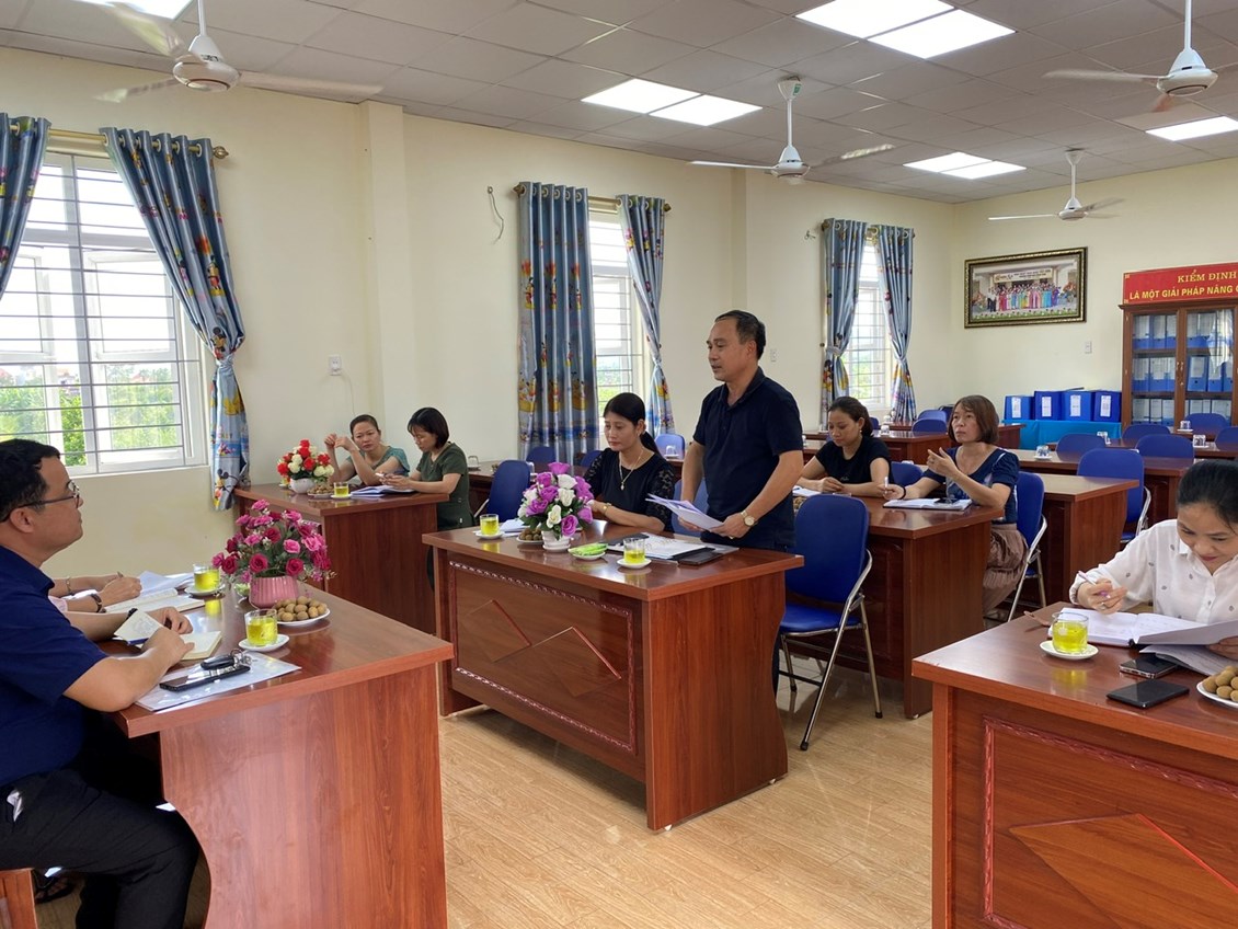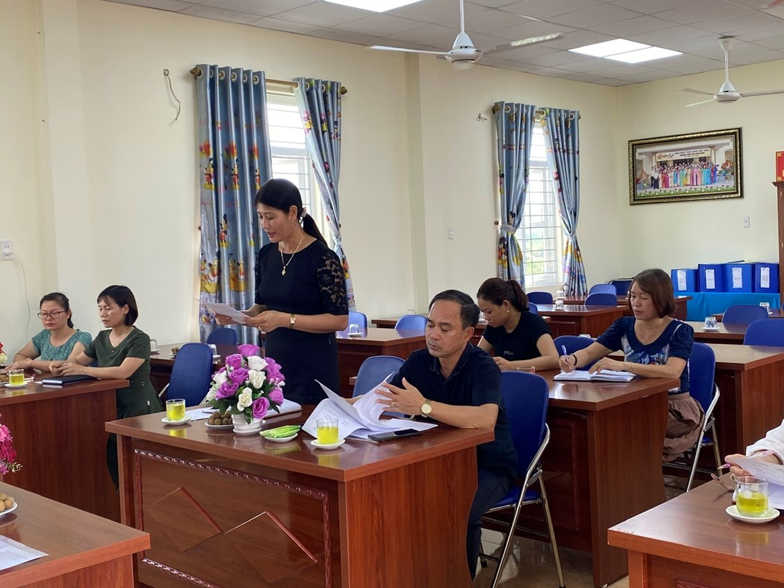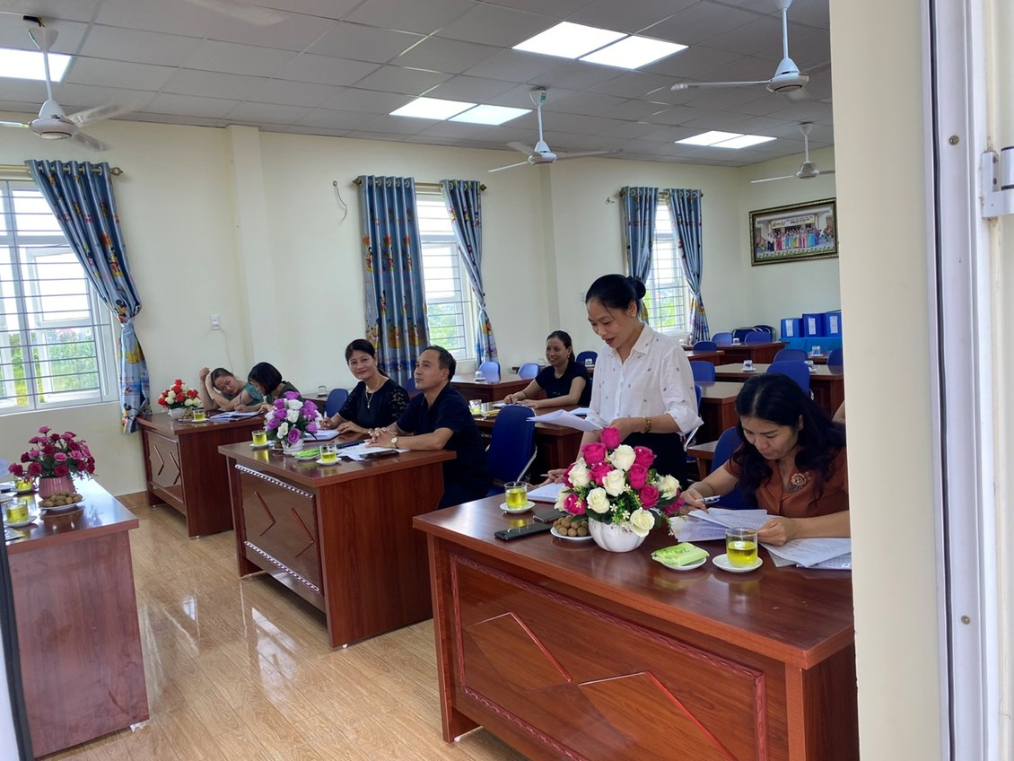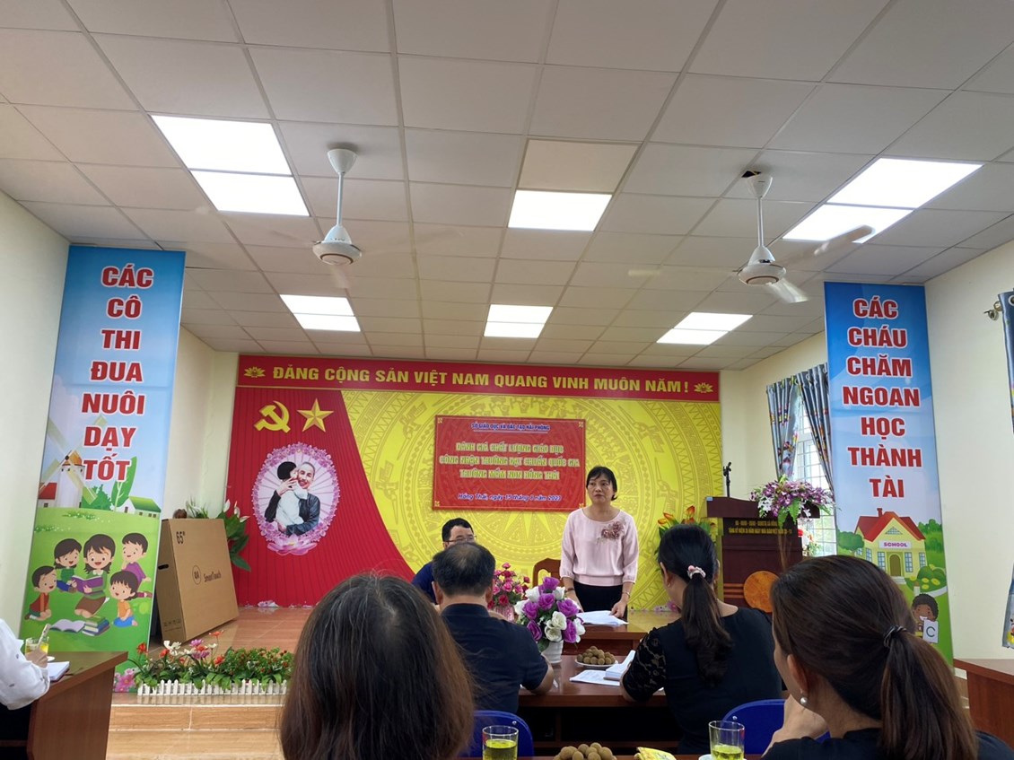 Đoàn được nghe đồng chí Vũ Thị Loan - Bí thư chị bộ - Hiệu trưởng nhà trường báo cáo cụ thể kế hoạch chuẩn bị các điều kiện đầu năm học và tổ chức ngày khai giảng năm học mới- ngày toàn dân đưa trẻ đến trường.