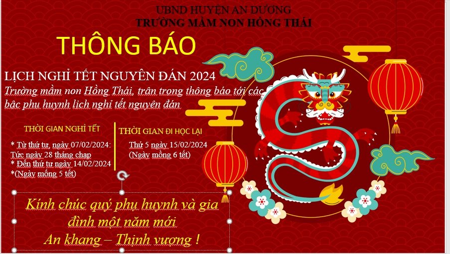 Trường mầm non Hồng Thái xin thông báo tới Quý phụ huynh về lịch nghỉ tết Nguyên Đán Giáp Thìn năm 2024 của nhà trường như sau: