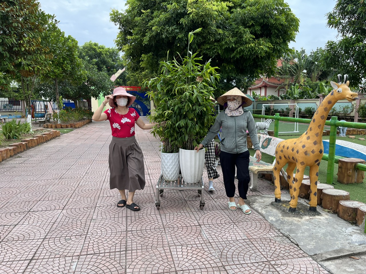 Hệ thống cây xanh được cắt tỉa bớt, cây cảnh được sắp xếp gọn gàng tại các khu vực có thể tránh được bão, chằng buộc hệ thống đồ chơi ngoài, cửa các phòng học các phòng chức năng. Các bậc phụ huynh cũng nhiệt tình chung tay cùng nhà trường chuyển hệ thống bao cát chắn trên hệ thống các mái tôn.