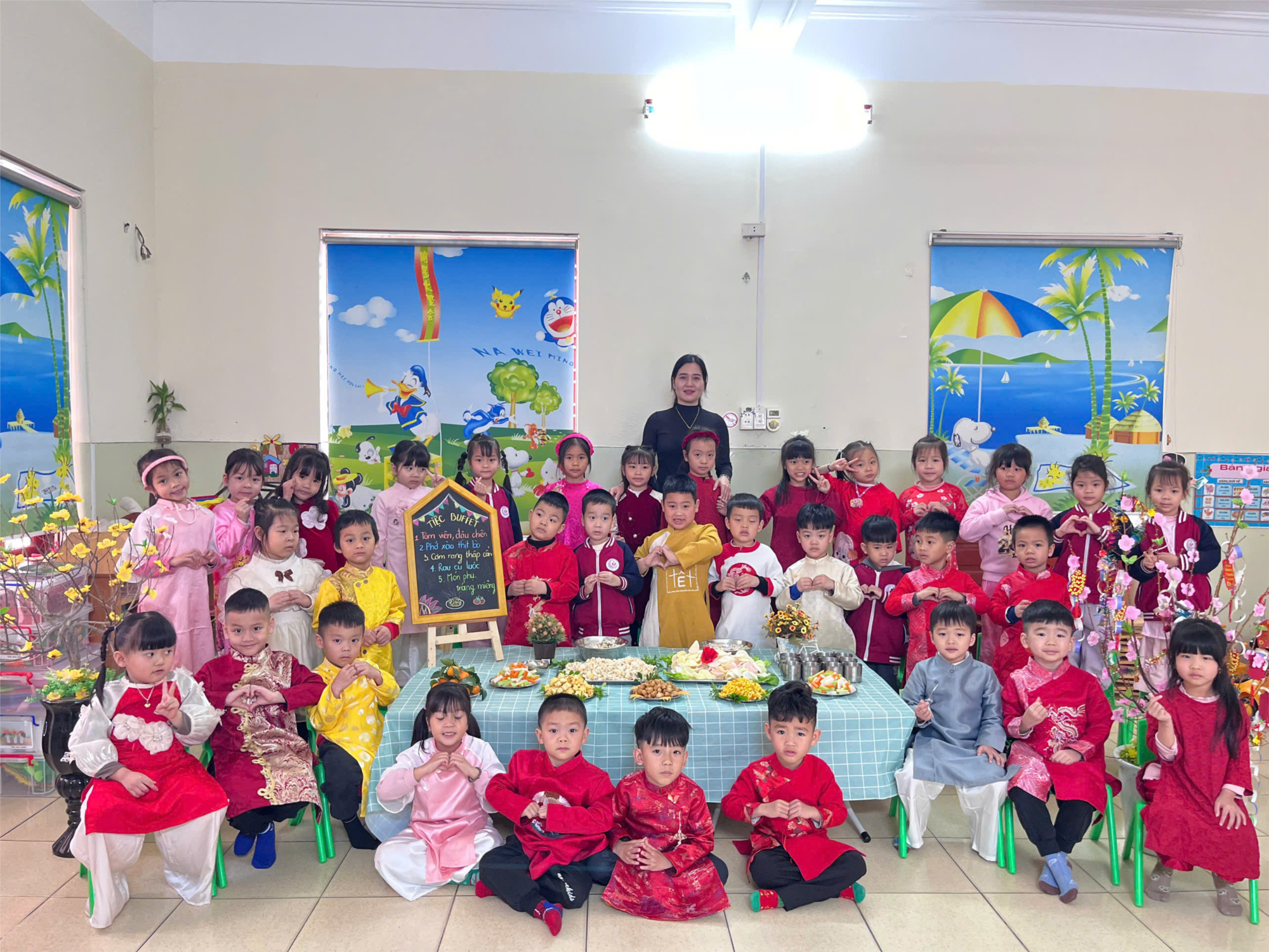 🌸 Tiệc buffet tất niên được tổ chức ấm cúng, giúp các con cùng nhau thưởng thức món ăn và chia sẻ niềm vui cuối năm.
