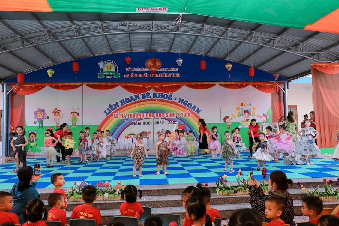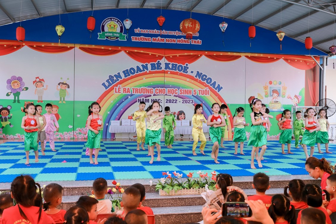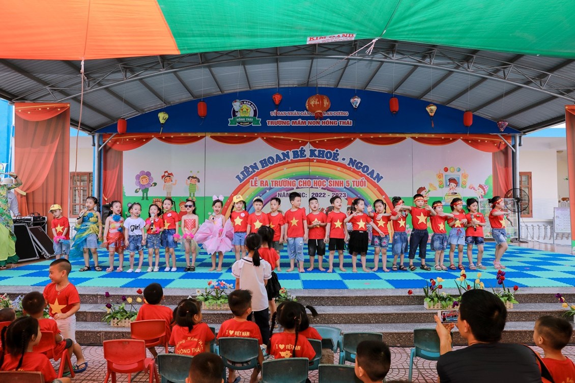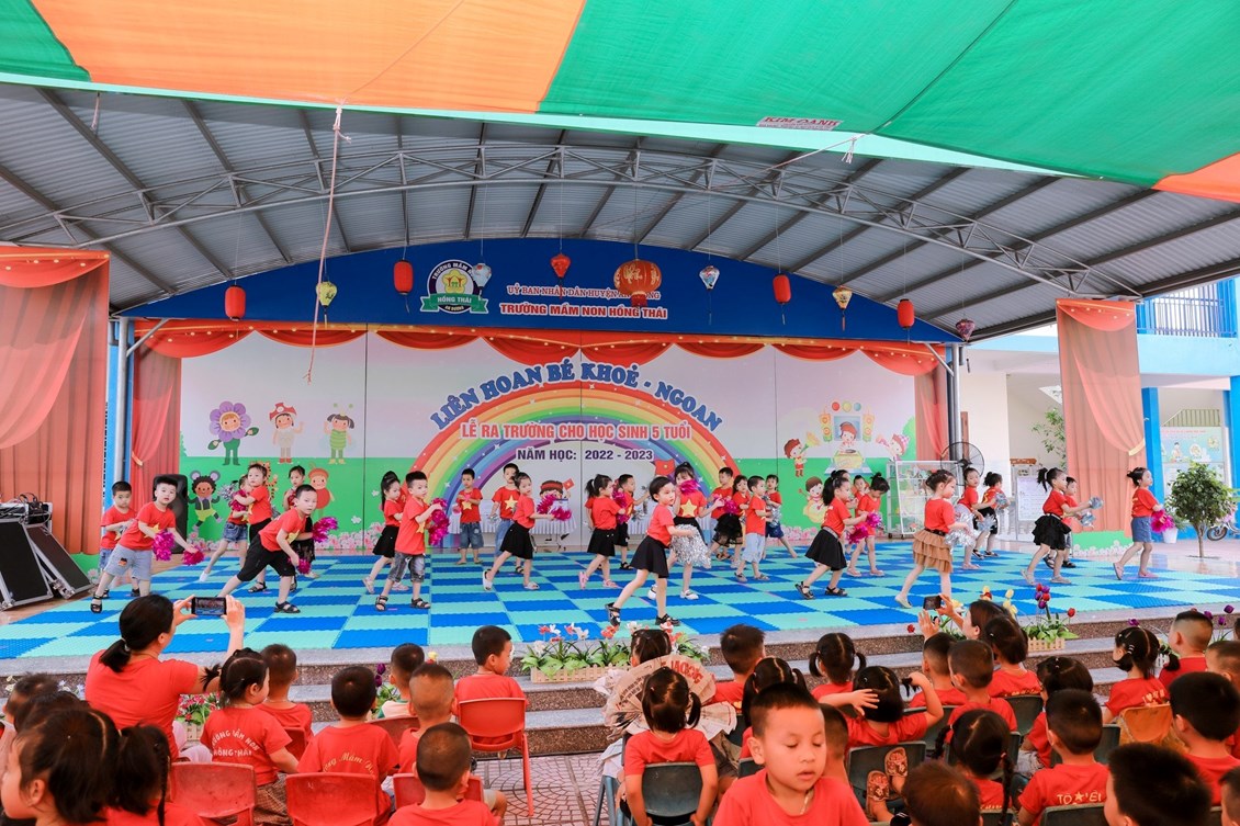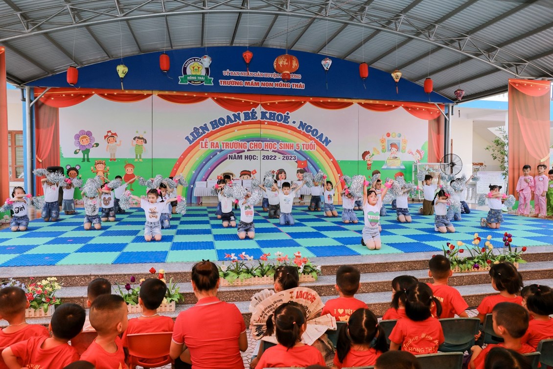 Ngày 23/5/2023 trường mầm non Hồng Thái tổ chức liên hoan “Bé khỏe ngoan” –“Lễ ra trường cho học sinh 5 tuổi” Tại buổi liên hoan các bé được tham gia biểu diễn các tiết mục văn nghệ đặc sắc; Trình diễn thời trang của các bé từ Nhà trẻ đến 5 tuổi; Khối 5 tuổi được tham gia trò chơi “Trạng nguyên nhí”; ngoài ra các bé toàn trường còn được tham gia rất nhiều trò chơi tập thể hay và bổ ích. Buổi liên hoan giúp các bé có nhiều cơ hội giao lưu, chia sẻ, thể hiện khả năng của mình trong các lĩnh vực khác nhau như: Tìm hiểu môi trường xung quanh, tìm hiểu luật lệ an toàn giao thông, chữ cái, số đếm, khả năng giao tiếp, giúp trẻ mạnh dạn, tự tin khi tham gia các hoạt động tập thể và đặc biệt trẻ lớp 5 tuổi sẽ vững vàng hơn khi bước vào lớp 1.