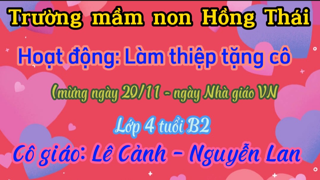 Ngày 20/11 hàng năm là dịp dành riêng để các em học sinh, sinh viên bày tỏ lòng biết ơn của mình với thầy cô giáo của mình. Với những em nhỏ thuộc lứa tuổi mầm non, các em còn quá bé để có thể tự mình gửi tới các cô giáo những lời chúc thể hiện lòng biết ơn, tri ân các cô. Chính vì vậy hôm nay, chúng con lớp 4 tuổi B2 đã sử dụng những nguyên liệu tự nhiên trang trí tấm thiệp mừng các cô giáo nhân ngày Nhà giáo Việt Nam 20/11.
