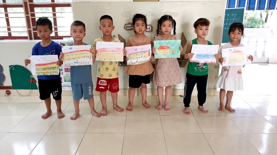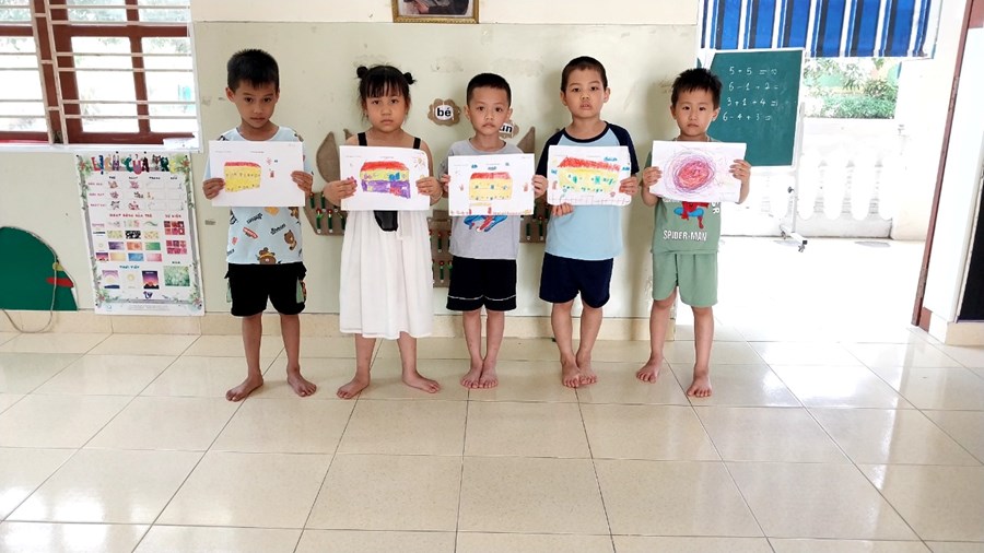 Giờ tạo hình cho trẻ "Vẽ trường tiểu học". Thông qua đó cô rèn cho trẻ tư thế ngồi, cách cầm bút. Các bé rất hứng thú và tạo ra sản phẩm rât đẹp. Cô còn dạy các con nhận biết 29 chữ cái và 10 số đầu