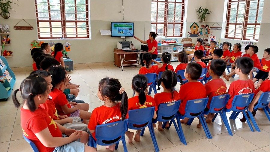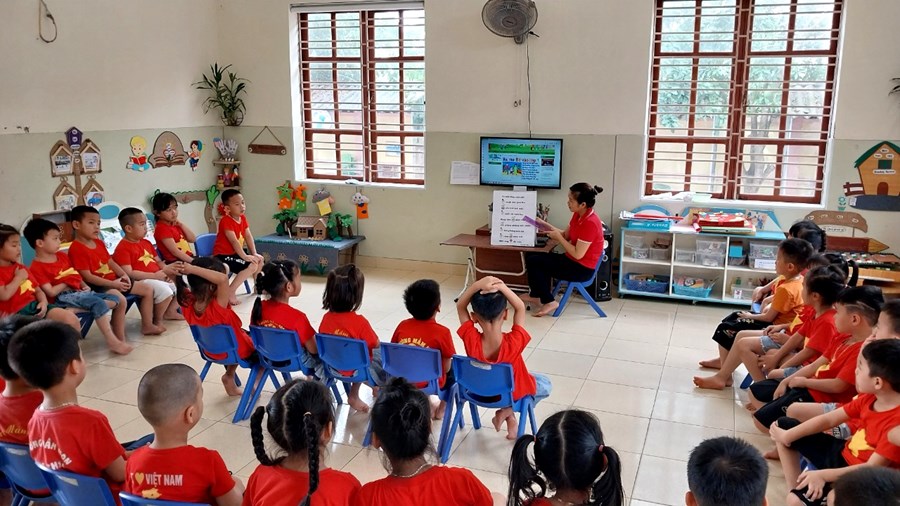 Cô dạy trẻ bài thơ " Bé vào lớp 1".