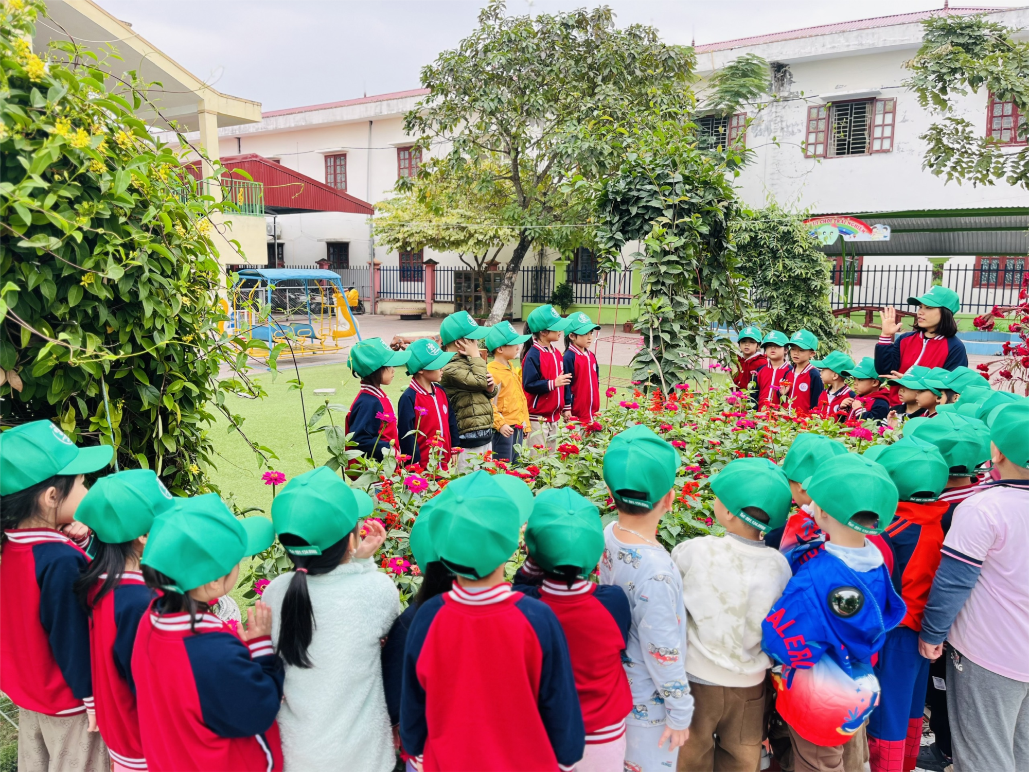 /-rose Các con được quan sát cây hoa cúc ngũ sắc trong sân trường. Qua quan sát, trẻ nhận biết được đặc điểm của hoa như màu sắc, hình dáng, từ đó hình thành tình yêu thiên nhiên và ý thức bảo vệ cây xanh, không ngắt hoa, bẻ cành.