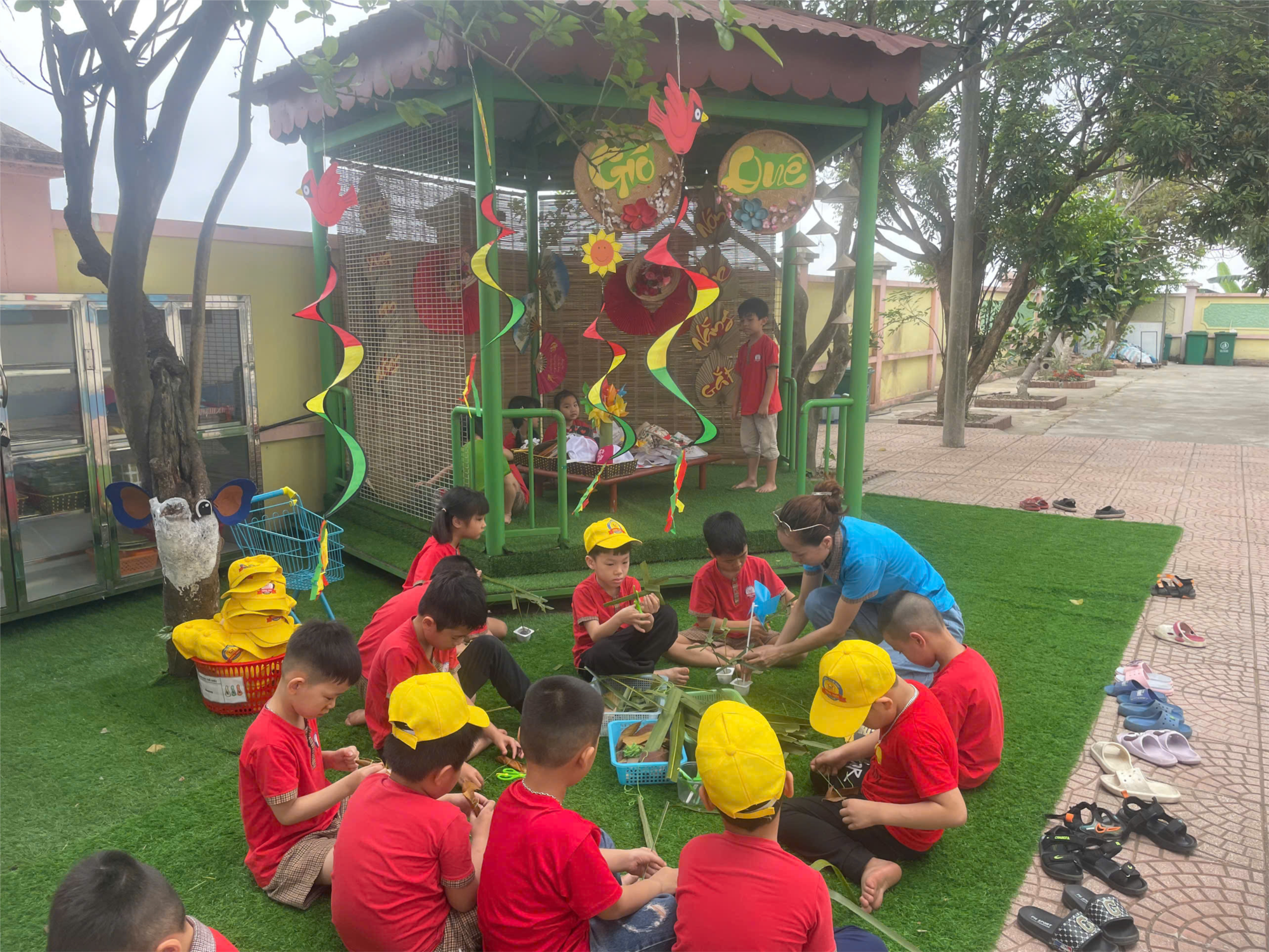 🍃 Một khu đặc biệt khác là góc làm chong chóng và đồng hồ bằng lá dừa. Tại đây, các bé sẽ được tự tay làm những chiếc chong chóng xoay tít và đồng hồ lá dừa xinh xinh – mang đậm nét quê hương Việt Nam.và cùng ngồi bóc lạc để mang ra các quầy hàng để bán.