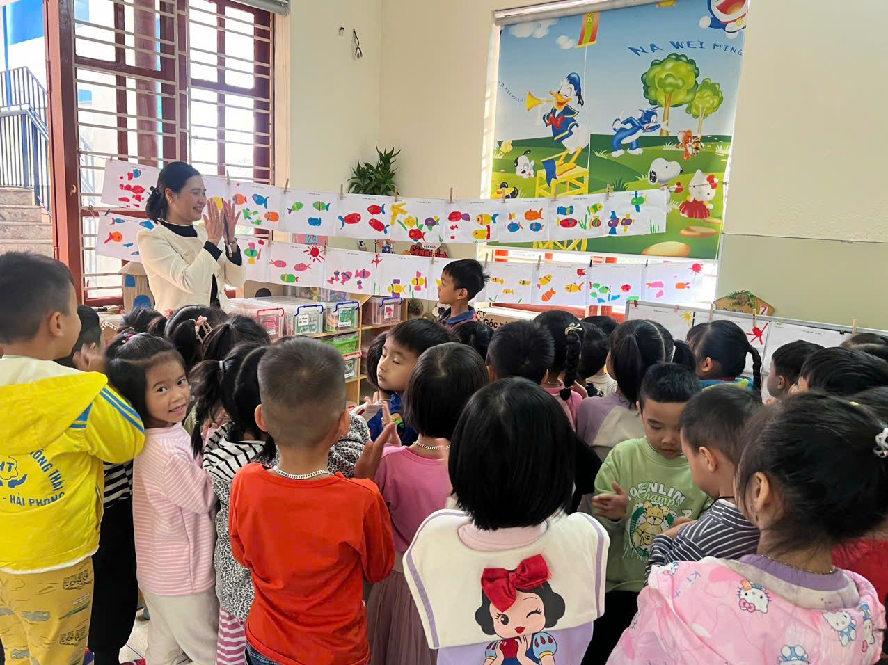 Hoạt động tạo hình có vai trò rất quan trọng đối với trẻ mầm non. Qua hoạt động phát triển ở trẻ khả năng quan sát, trí tưởng tượng sáng tạo, khả năng phối hợp giữa tay và mắt, hoàn thiện một số kĩ năng cơ bản. Đặc biệt trong giờ học xé dán, trẻ thích tự tay mình chọn màu sắc, tự tay xé chúng và dán chúng theo ý thích dù là xé các hình đơn giản như hình tròn, vuông tam giác, chấm tròn…nhưng mang lại cho trẻ những cảm xúc thật sự khi tạo ra được sản phẩm. Trong hoạt động xé dán đàn cá hình thành ở trẻ một số kỹ năng như: Kỹ năng phết keo, kỹ năng khéo léo của đôi tay, cách sử dụng màu sắc, sắp xếp bố cục…những kỹ năng này rèn luyện cho trẻ sự kiên trì, sáng tạo rất cần thiết với trẻ. Sau đây là một số hoạt động trong giờ học của các con, kính mời ba mẹ và các cô cùng xem nhé!