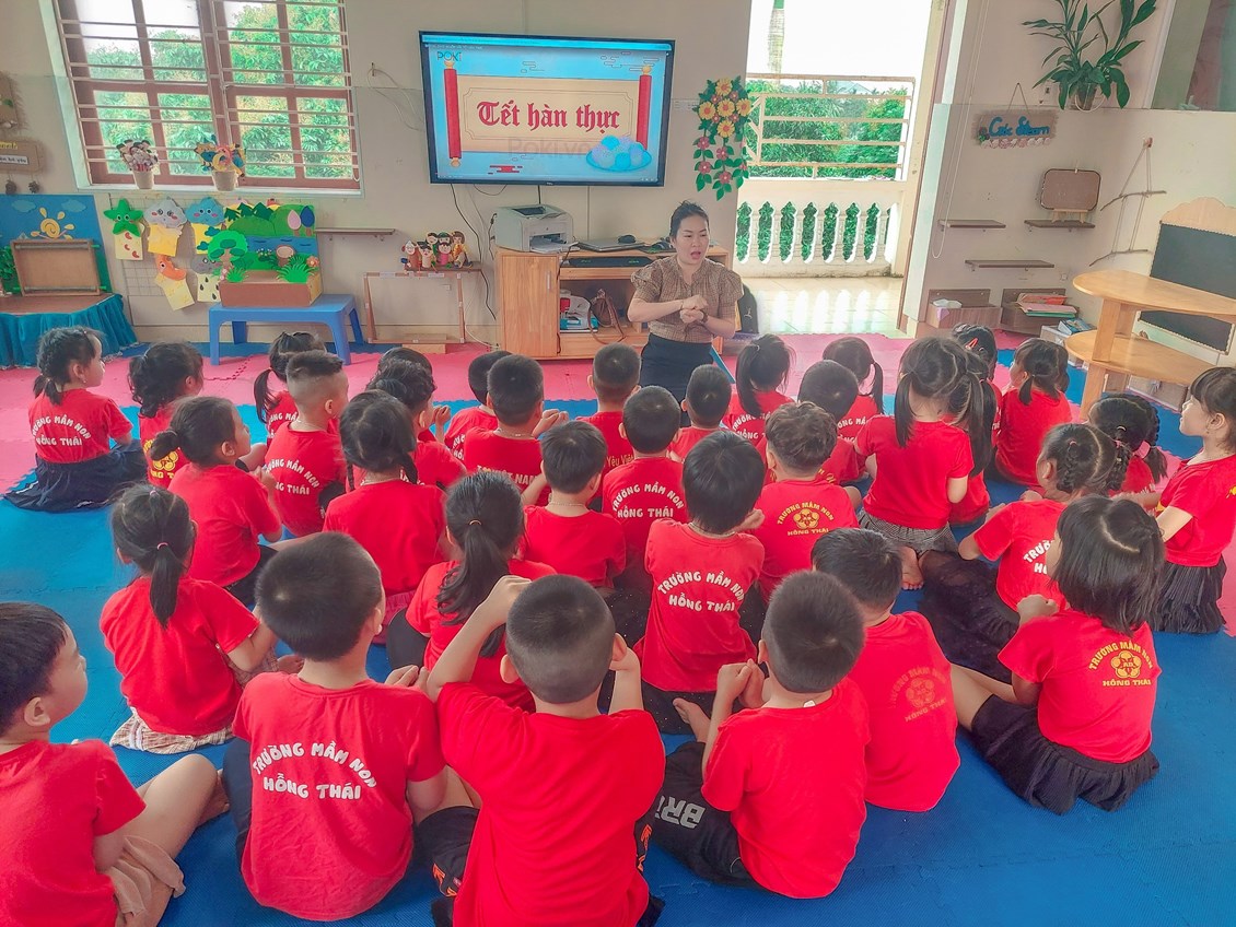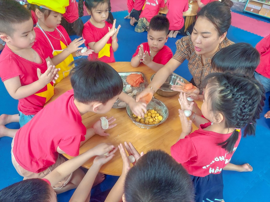 Với mục đích giáo dục cho trẻ về các ngày lễ, ngày hội truyền thống của dân tộc, giúp trẻ biết được ý nghĩa của Tết Hàn Thực cũng như mang lại niềm vui, hứng khởi cho các con, giáo viên lớp 5A4 của trường mầm non Hồng Thái đã tổ chức cho các bé buổi trải nghiệm làm bánh trôi tại lớp. Hoạt động này không những nhận được sự thích thú của trẻ nhỏ mà cả sự ủng hộ, tán thành của rất nhiều cha mẹ phụ huynh học sinh. Ở mỗi lớp cô giáo đã kể cho các con nghe về sự tích, ý nghĩa của ngày Tết Hàn Thực. Được nghe cô giới thiệu rất kĩ về ý nghĩa của ngày tết hàn thực, nguyên liệu, cách làm bánh trôi, nên khi thực hành nặn bánh, chẳng bạn nào bỡ ngỡ. Gì chứ xoay tròn, ấn bẹt chúng mình học mãi trong tiết nặn rồi nên thao tác chia bột, ấn đường, xoay tròn để cho ra sản phẩm là những viên bánh trôi trắng phau, tròn trại, xinh xắn chẳng khó tẹo nào.