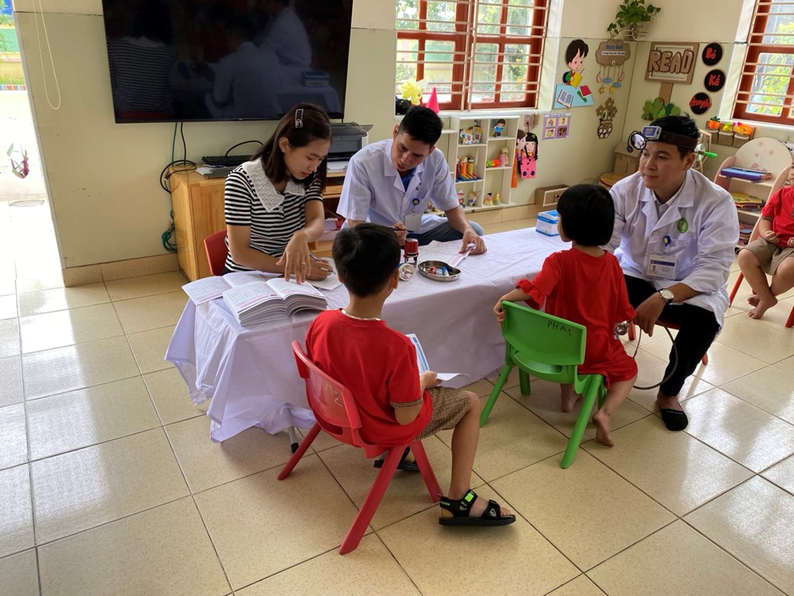 Một số hình ảnh minh họa trong buổi khám sức khỏe định kỳ cho trẻ tại Trường Mầm non Hồng Thái.