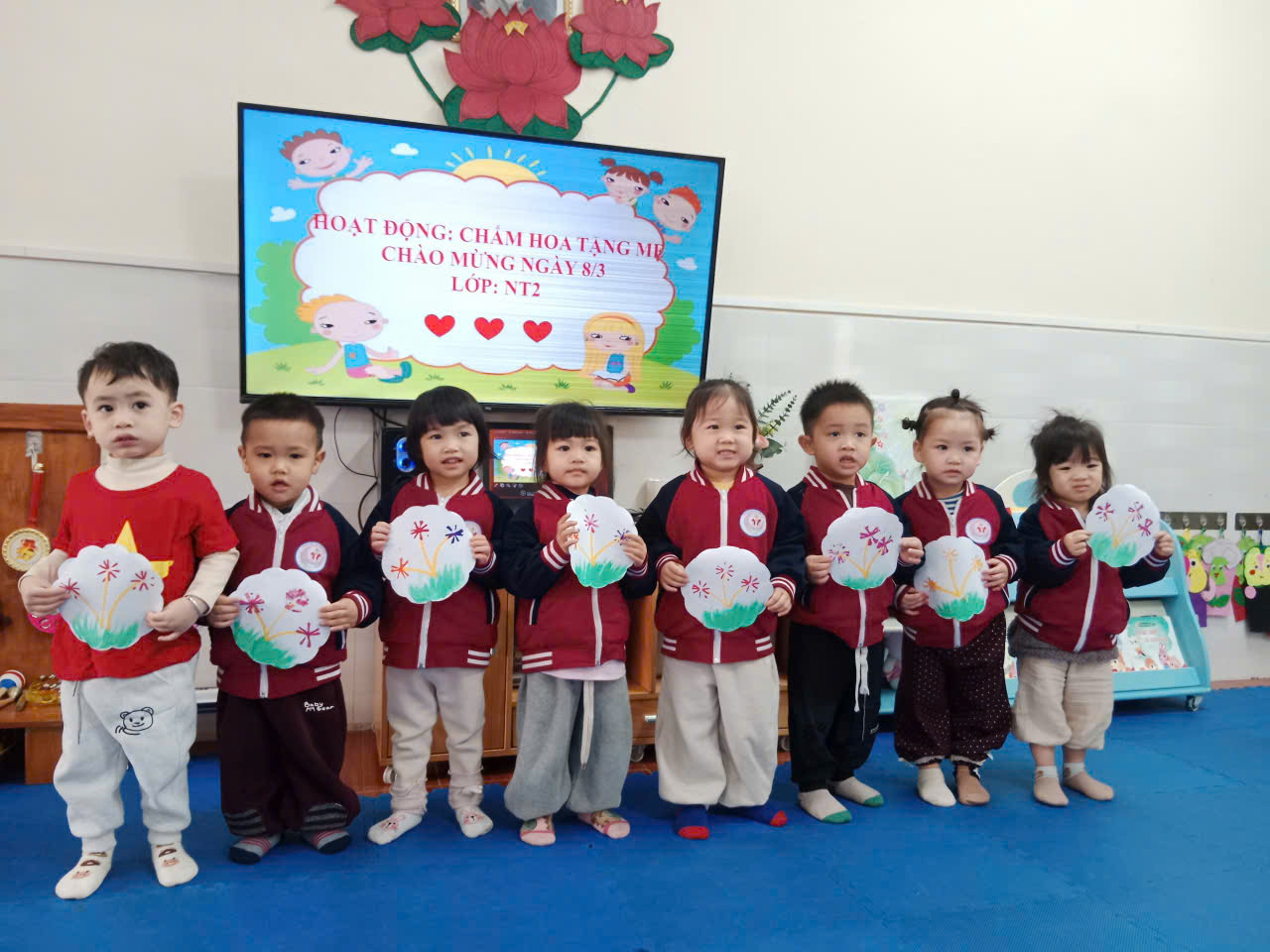 Từng đôi tay nhỏ xinh chấm màu – Tạo hình bông hoa tặng mẹ từng bông hoa đầy màu sắc xinh xắn và đầy ý nghĩa sẽ được các con dành tặng mẹ, bà và cô giáo nhân dịp Ngày Quốc tế Phụ nữ 8/3.
