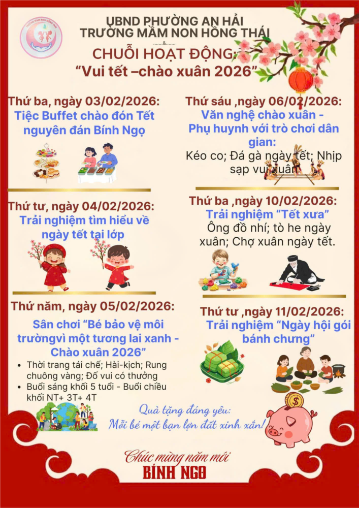 🎇Xuân về gõ cửa, Trường Mầm non Hồng Thái hân hoan mang đến cho các con chuỗi hoạt động “VUI TẾT -CHÀO XUÂN 2026” – nơi mỗi em nhỏ được trải nghiệm, vui chơi, khám phá và cảm nhận trọn vẹn hương vị Tết cổ truyền