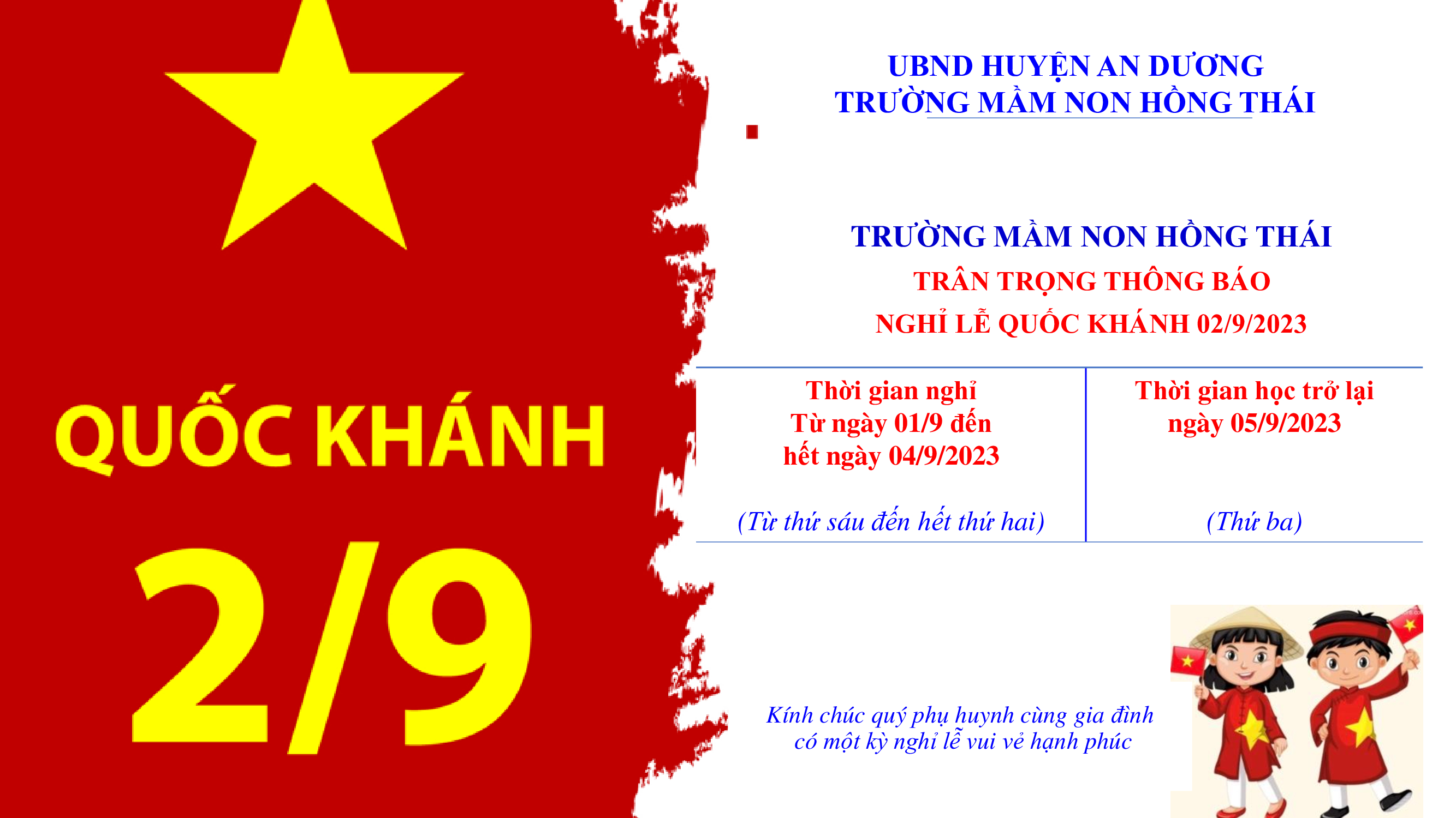 Trường mầm non Hồng Thái trân trọng thông báo lịch nghỉ lễ Quốc khánh 02/9/2023
